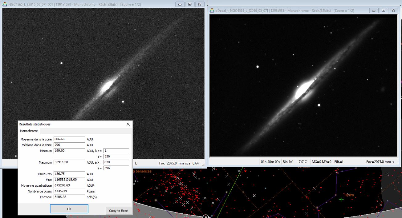 Ceci dit, la parti traitement j'en ai fais un tout petit peu lorsqu'on "shootais" avec un APN mais la en passant en CCD, hop faut reprendre de 0. J'ai chercher un temps de pose idéal pour avoir des pose unique non saturé (mais a 16 bits je regardais avec la fonction Prism qui s'arrête a 20 bits) et lorsque je les ampiles j'ai l'impression d'avoir qqch de trop puissant. avec la fonction DDP j'arrive a des extrêmes trop grande j'ai du mal a ajuster ces paramètres en fait. plus tout les autres filtres et autres traitement qui existe. En lisant l'aide local ou en ligne je fais que de cliquer sur des trucs que je pige pas et au final je sais même plus ce que j'étais aller chercher