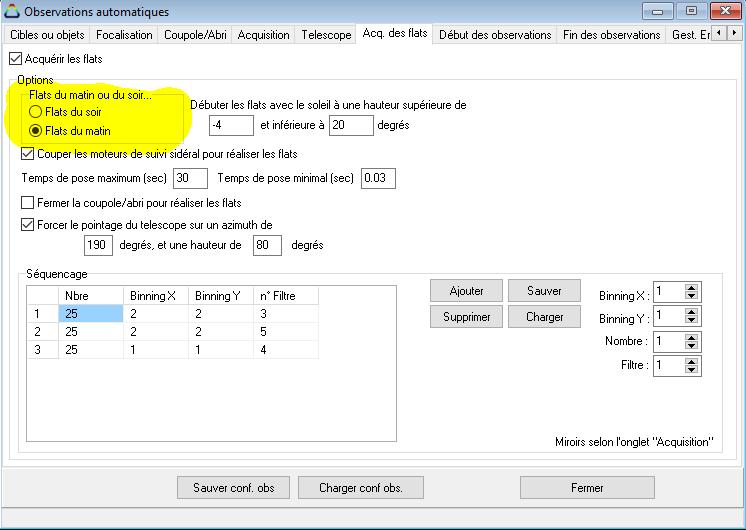 Serait-il possible de remplacer les boutons "Flats du soir" et "Flats du matin" par des cases à cocher de manière à se donner la possibilité d'exécuter les deux options afin de se donner le maximum de chance de réussir ces flats en cas de passages nuageux ?