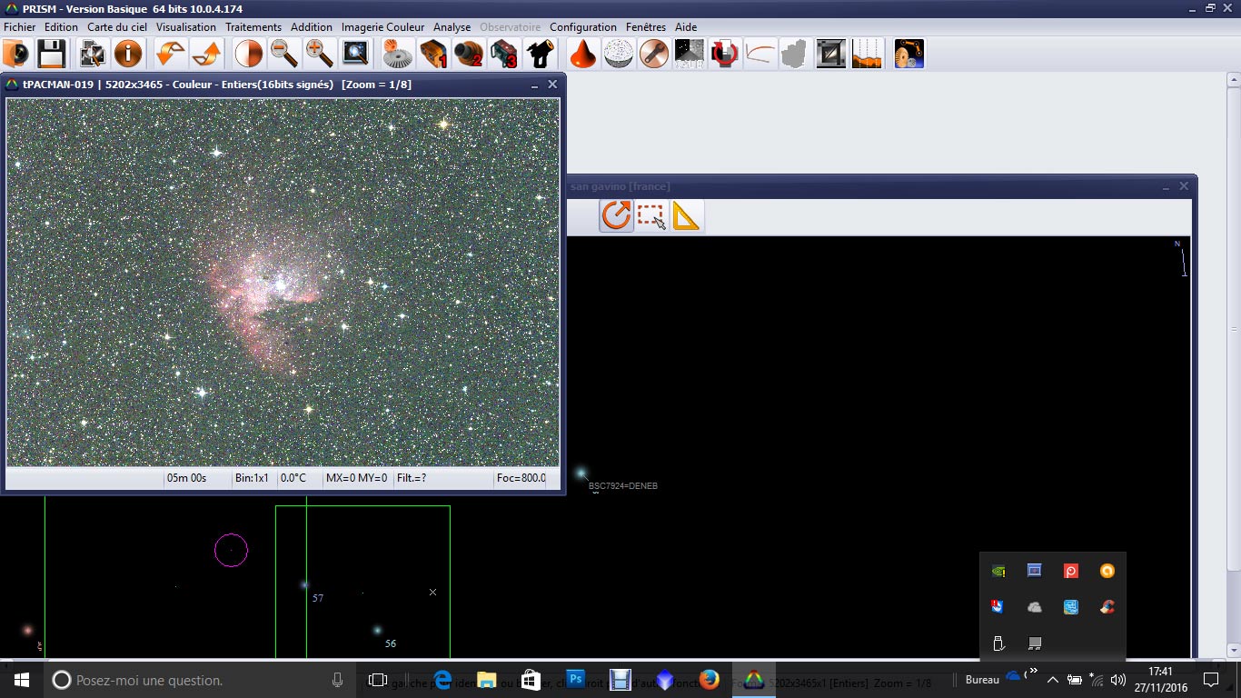 Voici la bulle et m52 avec la matrice 4. Pour qu'elle ne soit pas cramée, j'ai dû faire le prétraitement avec la version 64 bits de prism10 et en cochant dans addition, option "somme normalisée" (c'était des essais). En fit, cela n'a rien donné sur photoshop par exemple. Alors je l'ai exporté en 8 bits tif (version light) et sauvergardée en 16 bits dans un autre logiciel et là, il en est ressorti quelque chose de normal à priori dans photoshop à traiter.