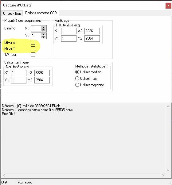 Je précise que j’ai fait l’acquisition des offsets et des darks avec miroirs X et miroirs Y à 0 c’est-à-dire cases décochées (copie d’écran), et que le fichier cosmétique est basé sur ces images maîtres (pas de miroirs).
