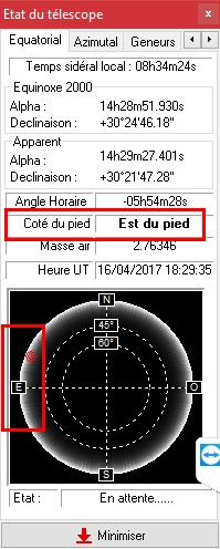 Cf : Paramétrage_autoguidage Dans la fenêtre "Etat du télescope" la case "Coté du pied" indique "Est du pied" quand je pointe vers l'Ouest, tout va bien.