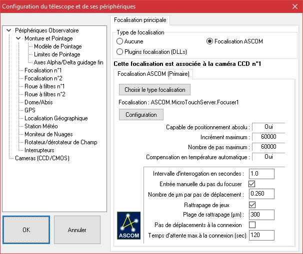 Peux-tu rajouter une copie d'écran de la configuration de ton driver ASCOM ?