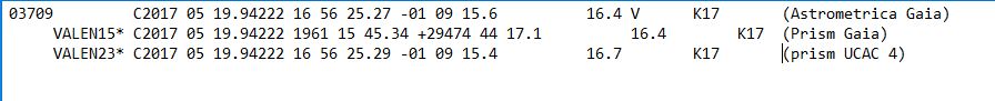 VALEN15* C2017 05 19.94222 1961 15 45.34 +29474 44 17.1 16.4 K17 (Prism Gaia)