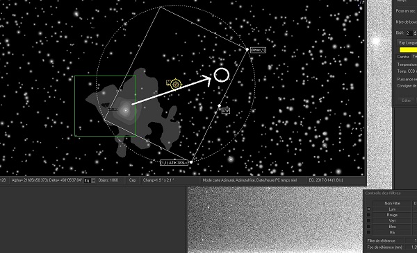 Dans la carte du Ciel, dans l'onglet CCD/Télescope, il faut configurer l'angle de la caméra CCD.