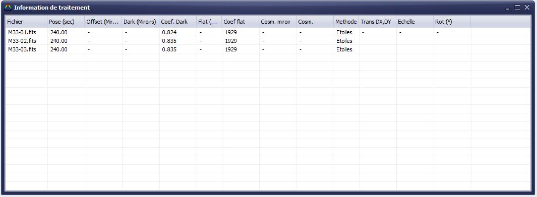 Sinon j'ai quand même d'autre questions.. J'ai réalisé mes offset,dark et flat maître mais impossible de faire un prétraitement correct. Lorsque je compile le tout, soit j'ai un message qui me dis impossible d'aligner les étoiles, soit il me dit images pas pris en compte, etc... bref j'arrive pas a faire qqch de correct. Surtout la fenêtre information du traitement me donne rien de similaire a ce que tu préconise sur la vidéo (print screen). Vu que franchement je sais plus quoi faire, j'ai regarder un peu partout dans les différentes options mais je pense que je loupe un truc je demande un petit coup de main.. vu que je sais pas trop comment faire, je vous donne toutes les infos, je vous donne également les images (4 de M33 pour tester cela suffit) + les maîtres (.fits) pour que qqn puisse tester... Si cela vous va. Si il est préférable que je vous donne les fichier CR2 pour faire un test depuis le début dite moi. Je met également quelques screen des options que j'ai mises comme pour la conversion de fichier par exemple