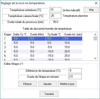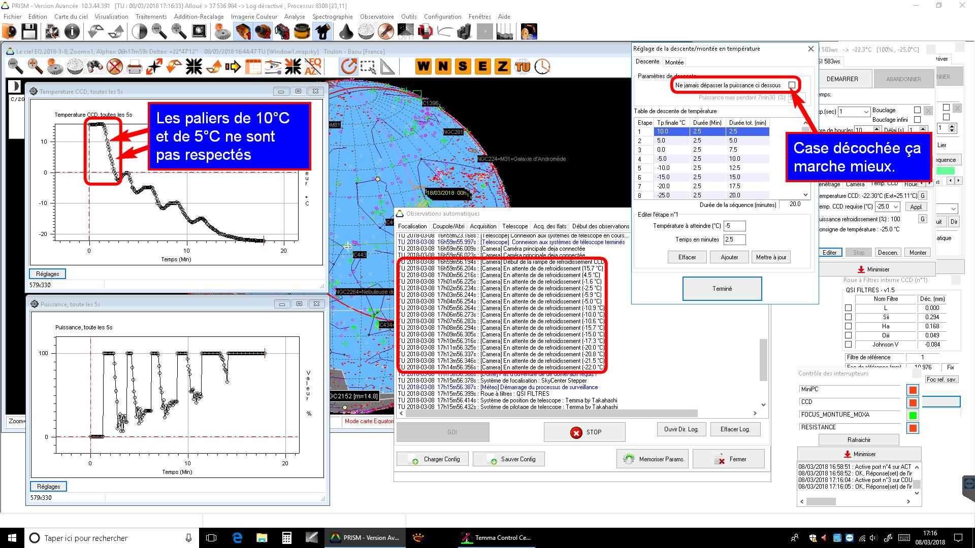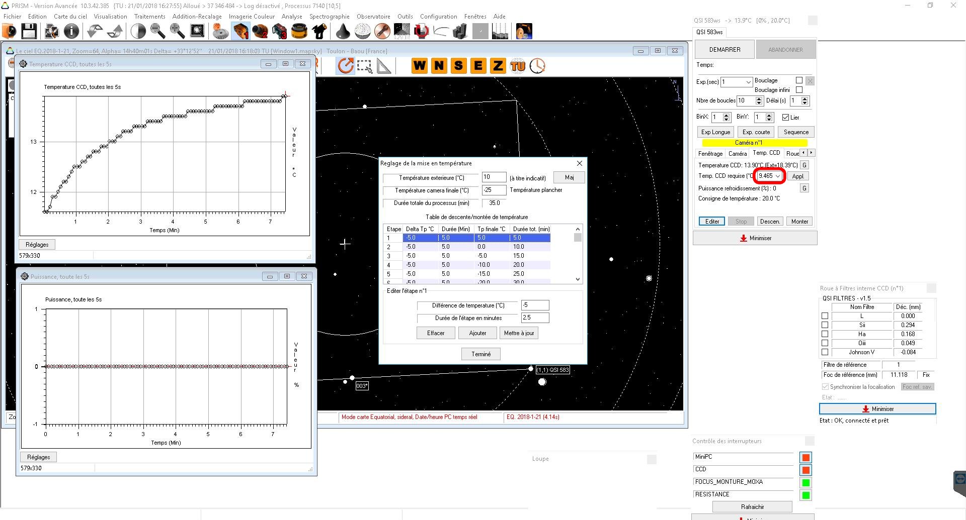 Je viens de faire une descente de température, sans module OBS-AUTO, en cliquant sur le bouton descente du panneau de contrôle de la caméra. La valeur (entourée en rouge dans la copie d'écran jointe) qui apparaît dans « Temp. CCD requise °C » est 9.46591328891624113E244. Ce qui me paraît en dehors des possibilités de ma caméra.