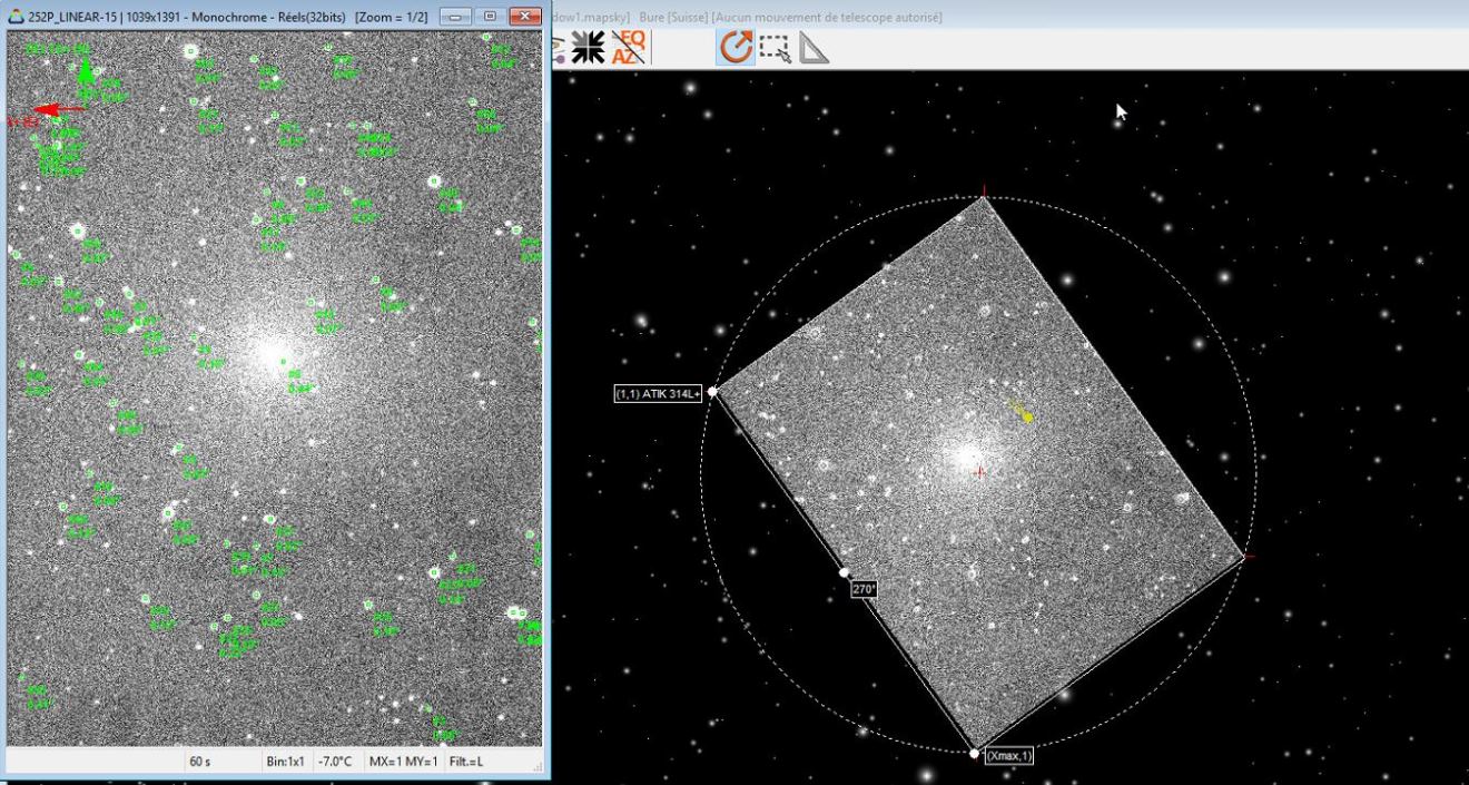 On voit que par rapport à ma photo, la comète n'est pas tout à fais à la même place est ce que cela peut influencer les résultats? Déjà le soir de l'observation j'ai constaté un décalage après avoir mis la base des comètes à jour. Me souviens plus si le décalage était de cette grandeur..