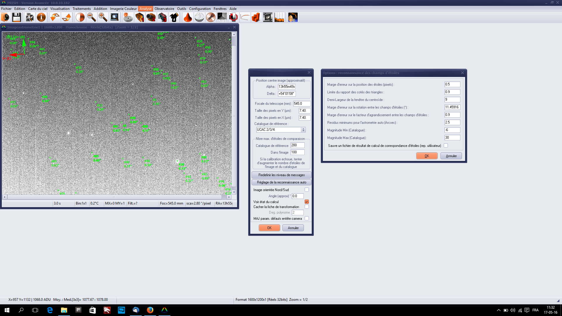 J'ai fait une modif dans la premiere passe de detection des etoiles, qui ne marchait pas bien avec les grosses etoiles de FHWM > 5 , ce qui arrive de + en + souvent avec les grosse focales combiné avec les mauvais seeings. Conscient que cela pouvait affecter les etoiles de petite taille, j'ai pourtant essayé avec des images de FWHM assez faibles venant d'une FSQ.