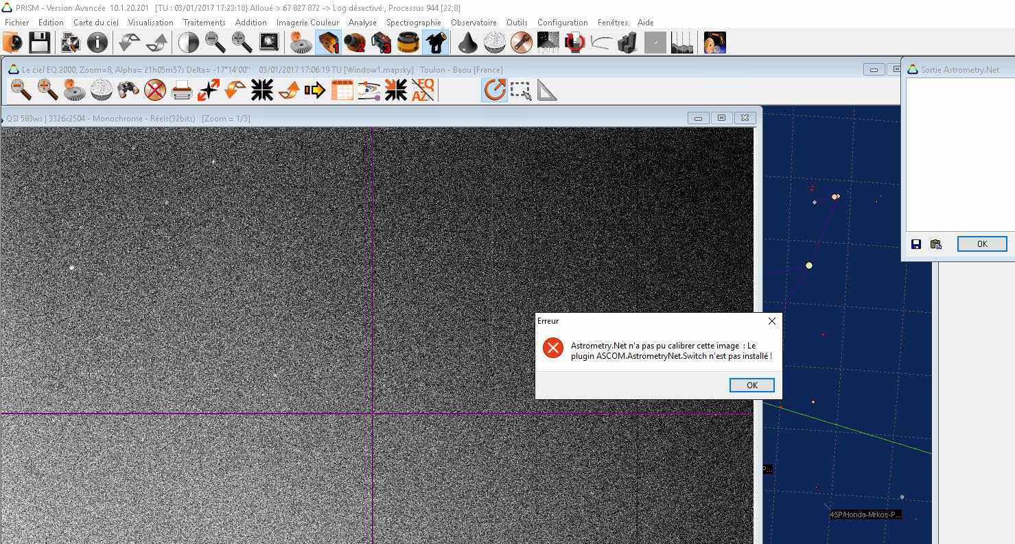 J'ai donc installé PRISM64 comme indiqué dans mon message précédant, puis j'ai renommé le fichier PRISM.EXE.OLD afin de revenir à la version 10.1.19. Je l'ai exécuté pour forcer la mise à jour en 10.1.20. Et maintenant astrometry.net re-fonctionne.