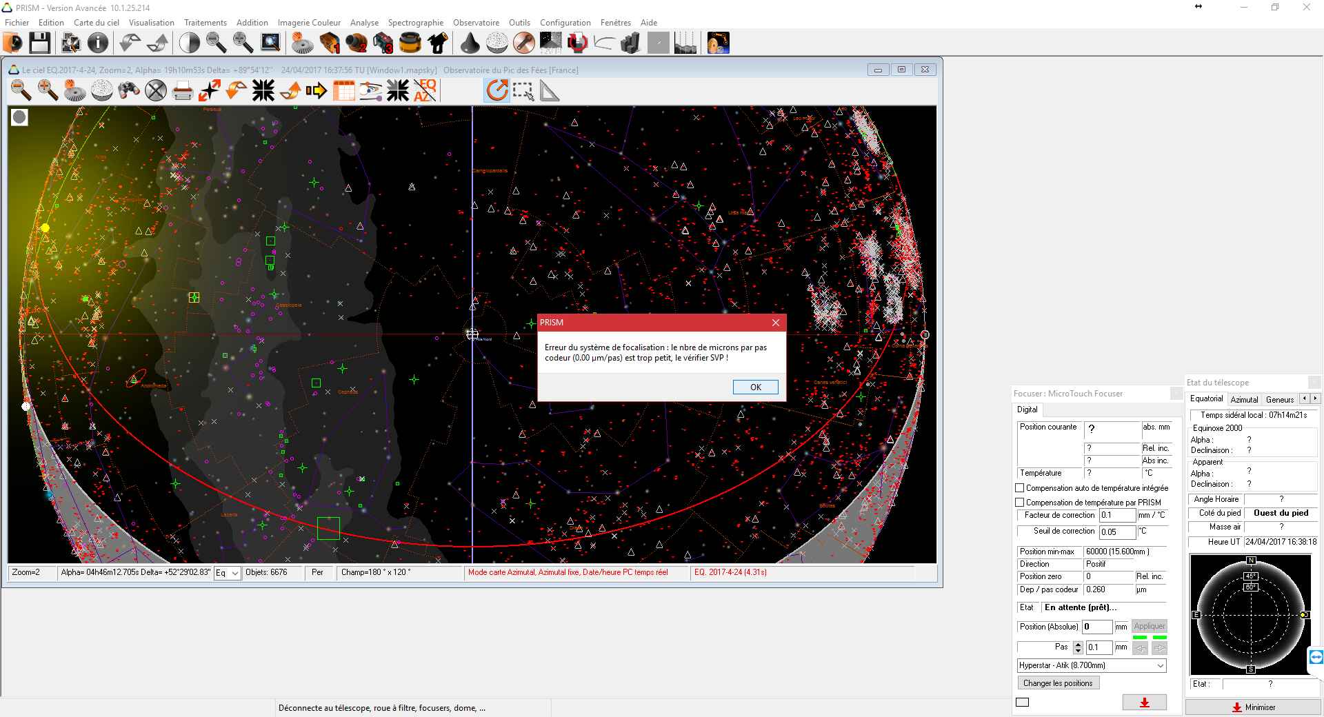 Après avoir rentré les données et cochés les bonnes cases, je démarre le "Télescope" et tout va bien : Je coupe la connexion et quitte Prism. Après le redémarrage de Prism la configuration s'est légèrement modifiée : Si, uniquement, je coche la case "Entrée manuelle du pas focuser", je retrouve la configuration initiale. Tout va bien, test OK : Au bout de plusieurs (variable) redémarrages de Prism, la configuration est perdue. En démarrant de "Télescope" j'obtiens les erreurs suivantes : Je suis alors obligé de cocher à nouveau la case "Entrée manuelle du pas focuser" et de rentrer la valeur 0.26 dans "Nombre de µm par pas de déplacement :".