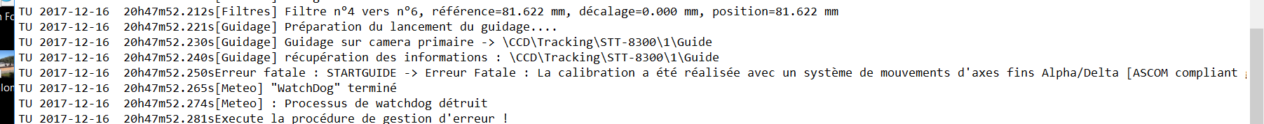 TU 2017-12-16 20h47m52.250sErreur fatale : STARTGUIDE -> Erreur Fatale : La calibration a été réalisée avec un système de mouvements d'axes fins Alpha/Delta [ASCOM compliant guider] différent de celui que vous voulez utiliser pour le guidage [SBIG camera relays guider] Solution : refaites la calibration avec ce systeme : [SBIG camera relays guider]