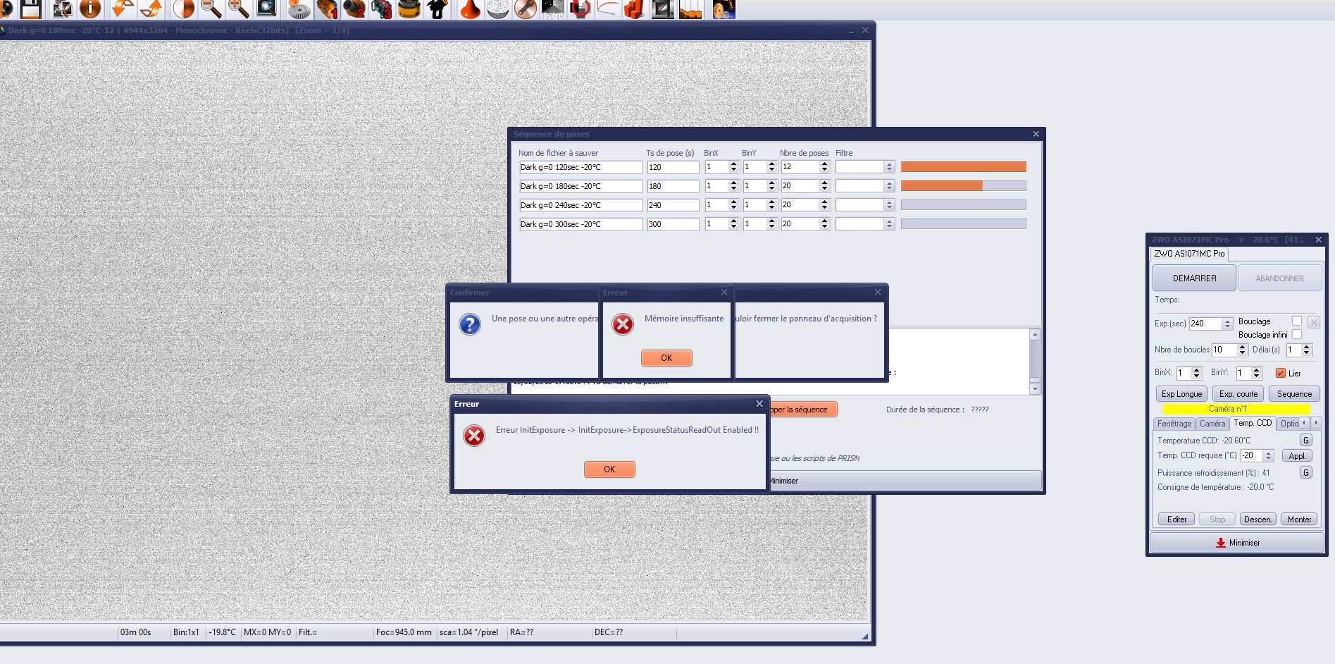 Le démonstration se faisant ensuite en utilisant Prism sans le dongle en version évaluation (j'ai encore des jours disponibles suite a une nouvelle installation). Tout fonctionne a nouveau et de manière robuste ie pendant plusieurs heures a acquérir des dark! J'ai répété l’opération 3 fois et même constat.