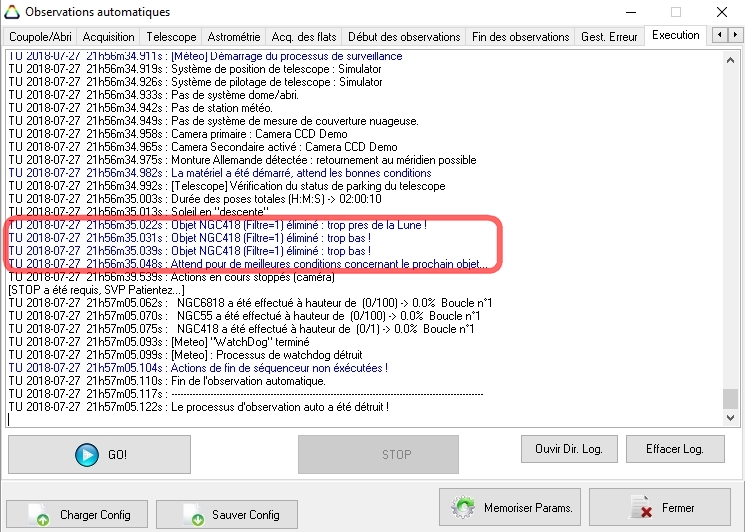 Par défaut, il me semble que PRISM pointe les cibles dans l’ordre de l’heure du lever des cibles. Comme le premier objet est trop près de la Lune PRISM passera à l’objet suivant par ordre de temps de lever soit NGC418, mais il l’affiche 3 fois alors que, à mon avis, on aurait du avoir :