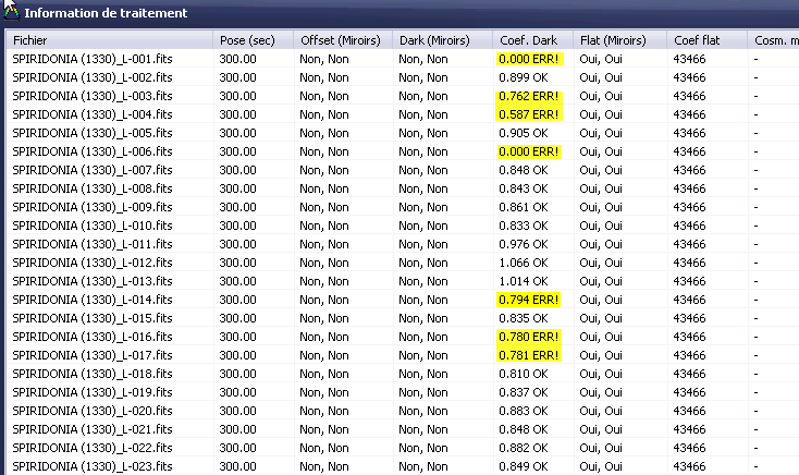 Et dans cette fenêtre, je vois pour plusieurs images que dans la colonne Coef. Dark il y a "ERR!" (pour Erreur je suppose ?) à coté du coefficient appliqué.
