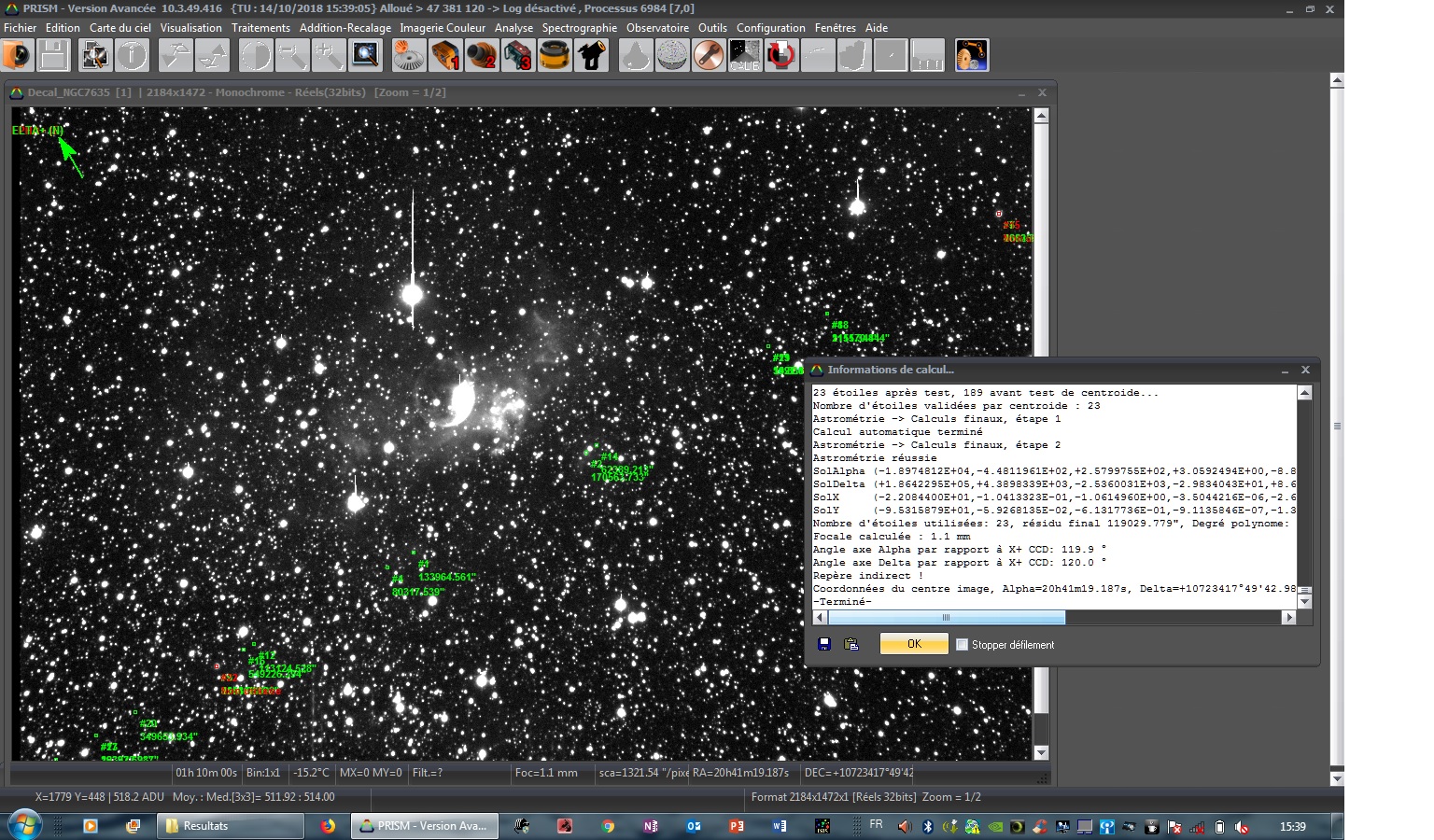 j'ai besoin de comprendre ce que je lis après avoir effectué cette astrométrie de NGC7635, ayant convenablement indiqué les coordonnées,les dimensions des pixels,la focale (=996mm),un nombre d'étoiles de comparaison, le catalogue de référence (GSC)