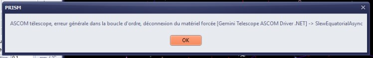 Ces mêmes coordonnées de parking rentrées dans le driver ASCOM « Gemini Télescope .NET », ne provoquent aucun plantage quand je lance le parking, je pense que le problème vient donc de Prism.