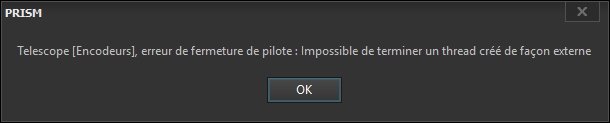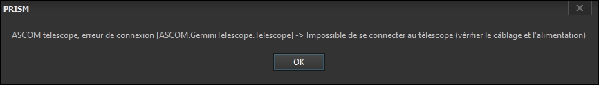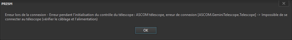 J'ai constaté le même dysfonctionnement entre Prism v10 et le driver ASCOM Gemini 2 chez un ami. Ce driver ASCOM n'a pas été modifié depuis au moins 2 ans (de mémoire). Je n'ai pas testé mon observatoire à l'avant dernière mise à jour.