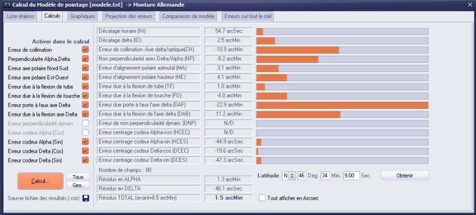 Ce que je peux dire c'est qu'un residu de modele de pointage superieur a 2 arcmin indique que dans le tube optique ca bouge (optiques, cameras), mais ca ne vous indiquera pas ce qui bouge, il faut faire des tests, changements et de nouveau un modele.