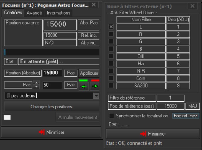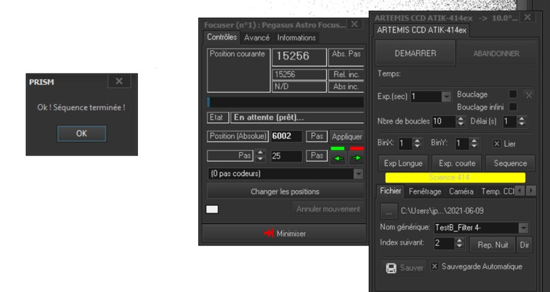 J'ai fait le test avec une séquence d'acquisition d'images avec chaque filtre de la roue, 1 pose pour chaque filtre, LRGB... et retour au premier filtre L). La roue et le focuser sont configurés comme dans les messages ci dessus. Même mouvement de 2 pas codeurs au changement de filtre R puis etc... constaté. AU retour final au filtre L Prism revient à la position initiale+1 pas codeur.