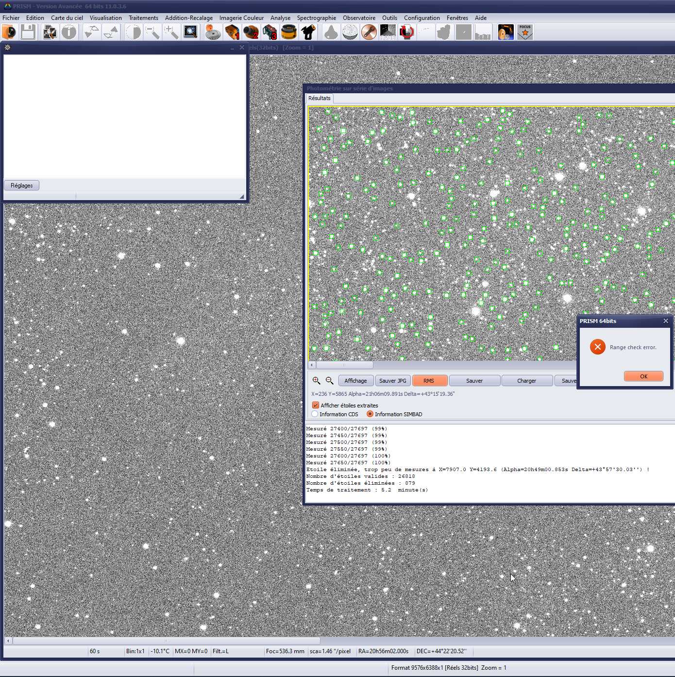 En effet, après calculs, lorsque l’on clique sur le bouton RMS une boite de dialogue affiche « Range check error » et la fenêtre du graphique RMS s’ouvre mais n’affiche pas la courbe RMS en fonction de la magnitude, l’écran reste blanc sans afficher de points. Après avoir fait des essais avec différentes images je n’ai pas trouvé de corrélation avec les dimensions de l’image ni le nombre de pixels dans l’image ni le catalogue d’étoiles (GSC, UCAC, GAIA DR1...).