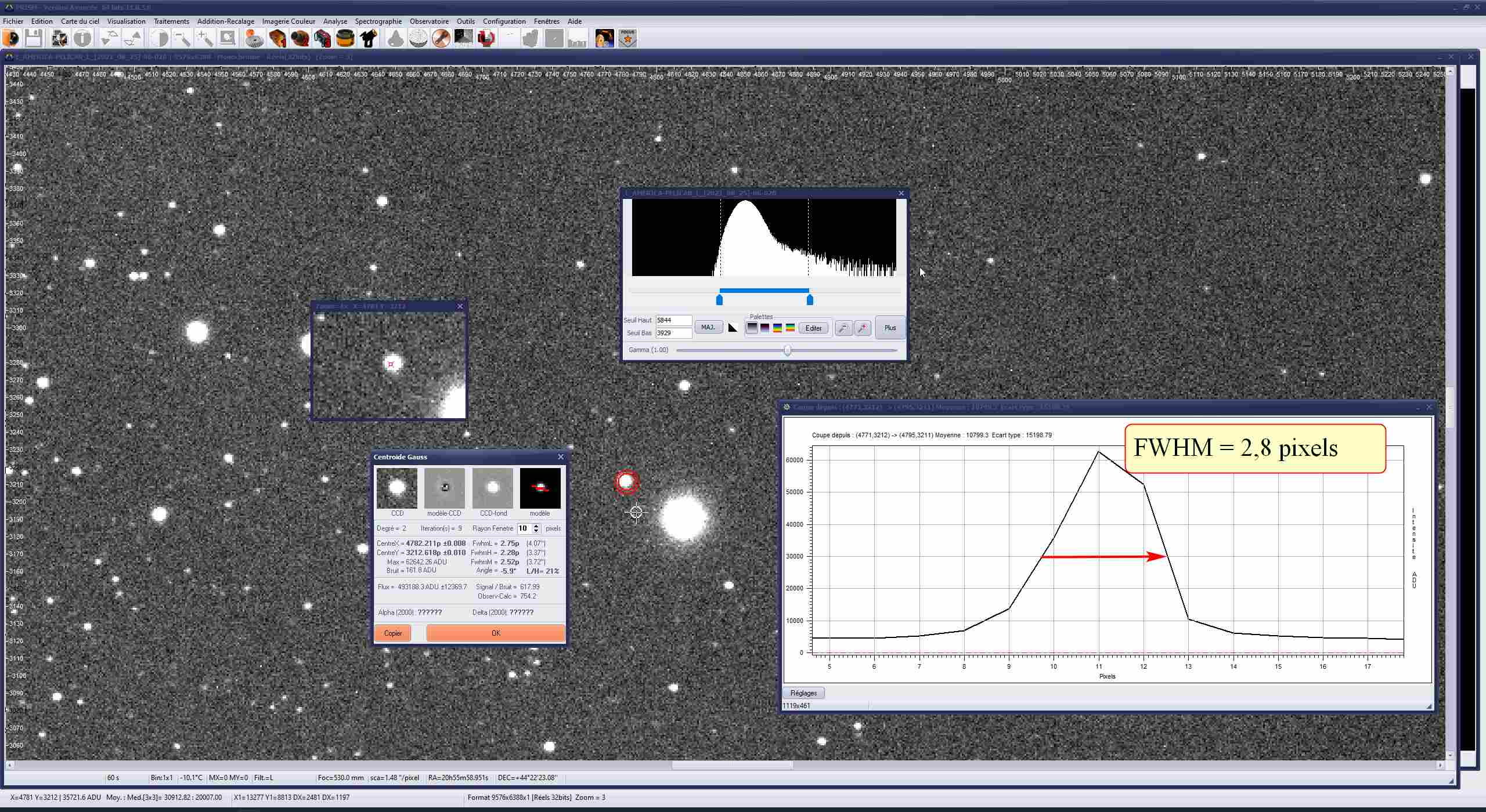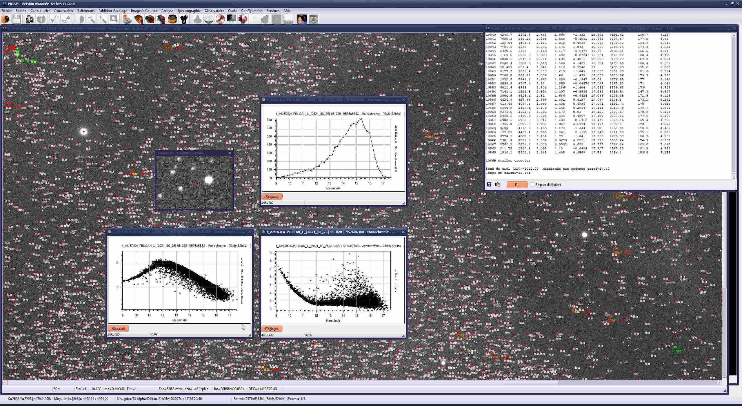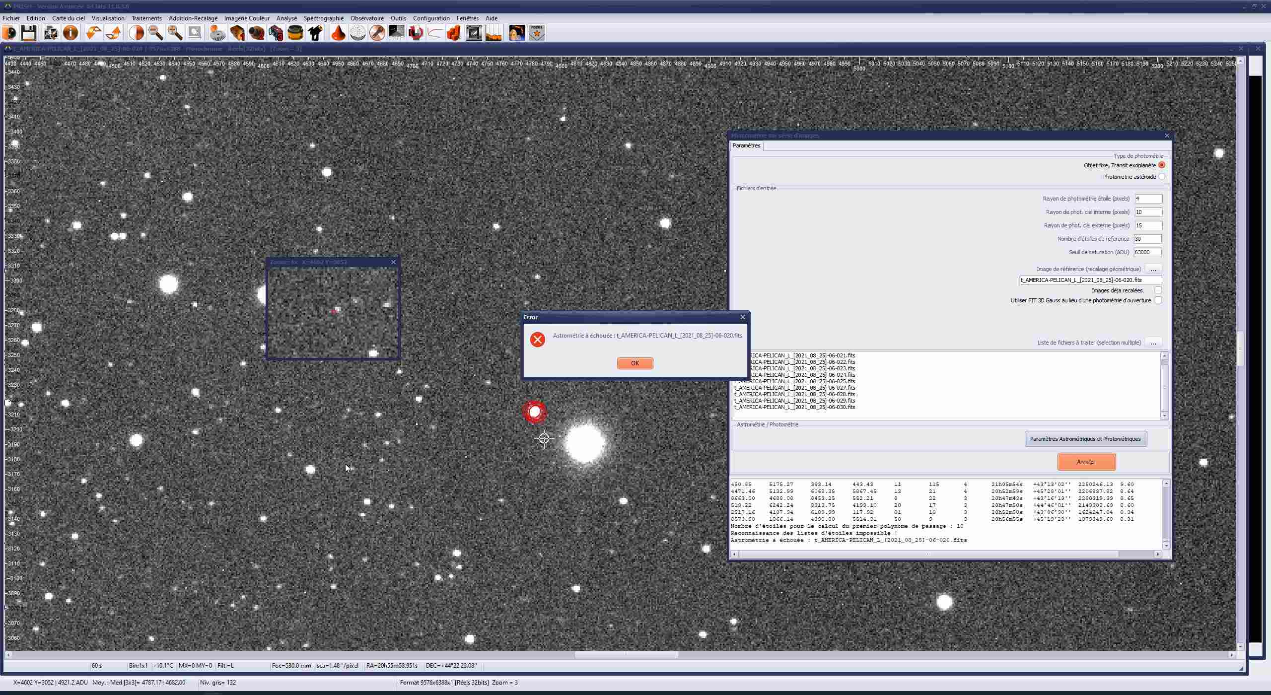 Malheureusement le bouton RMS de la fonction « Photométrie sur une série d’images » ne fonctionne pas avec la caméra ASI6200MM-Pro en haute résolution 9576x6388 couplée à ma lunette FSQ106 de 530mm de focale et donnant un champs de 3,9° x 2,6° à partir d’un certain nombre d’étoiles valides.