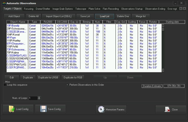 2 nuits de suite, j'ai fait une série d'observations de 16 comètes dans une liste auto-compilée avec objet d'importation. J'ai placé les comètes à observer dans cet ordre. Cela a également été fait, sauf lors de l'observation d'un objet dont le temps s'est écoulé depuis minuit.