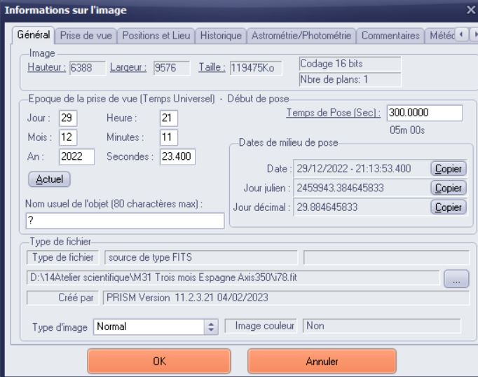 Voici le fichier original non prétraité (https://www.grosfichiers.com/yBtLyegWp5c). Même anomalie, même données informationnelles. En outre, on peut voir dans la fenêtre Informations sur l'image de mon premier message une incohérence entre l'Epoque de prise de vue (première copie écran) et l'heure de milieu de pose. Le bug est là je pense.