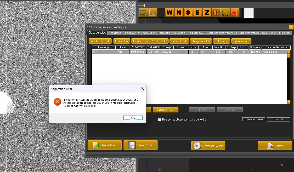 Après avoir installé Prism 11 et configuré, je lance la première liste. Après l’acquisition de la première image le message suivant apparait (capture d’écran jointe) je clic sur l’onglet OK et le logiciel ce ferme. J’ai fait l’essais plusieurs fois, et le même résultat. Le logiciel fonctionne sous windows