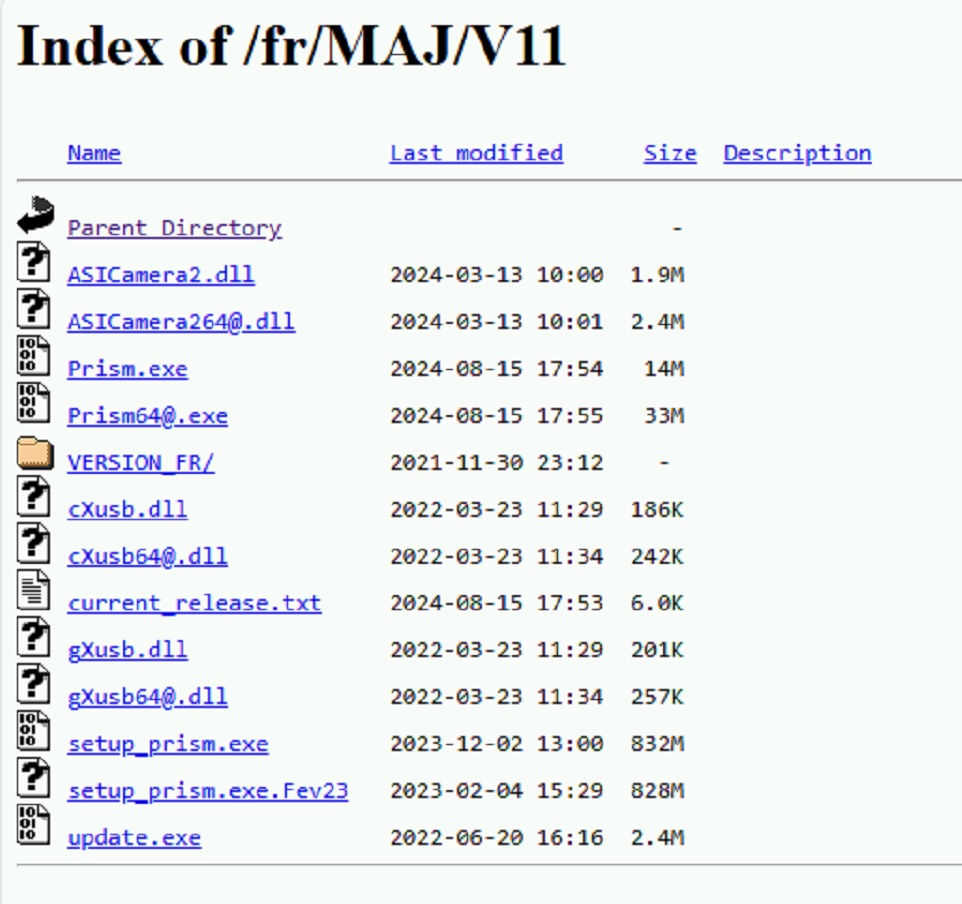 On my observatory computer i still have the old version 11.4.19.39, and when pressing "Mettre a jour PRISM par internet" it says: Pas de mise a joer disponible, vorte version est a jour"