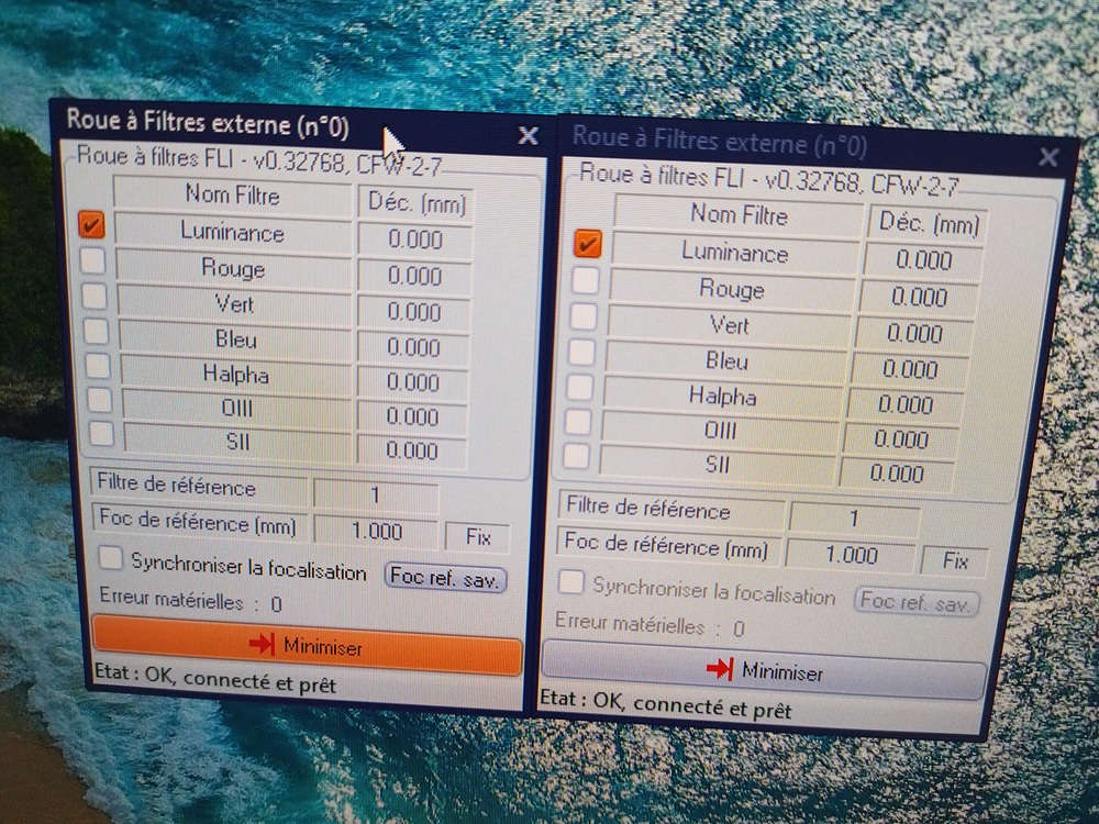Quand je demande au logiciel de se connecter à l'ensemble du matériel il n'y a aucun problème et tout est reconnu (cf photo PRISM_RAF et Prism_RAF_2). Le problème est que lors de l'initialisation de la RAF, il initialise deux fois la même RAF. Malgré les deux fenêtres différentes pour changer les filtres, seule une RAF est fonctionnelle.