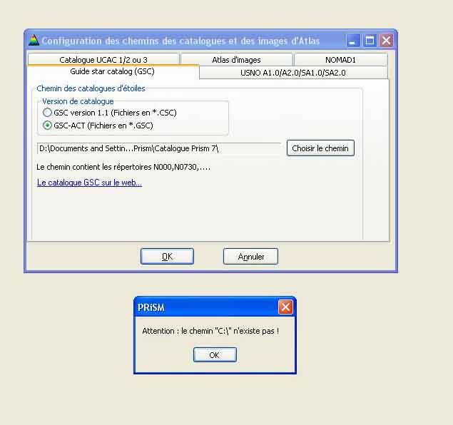 Pour le chemin des catalogues, Prism me dit que le chemin C:\ n'existe pas, je suis d'accord car je n'ai que le D:\ tu verras sur l'image jointe que c'est bien ce que je demande.